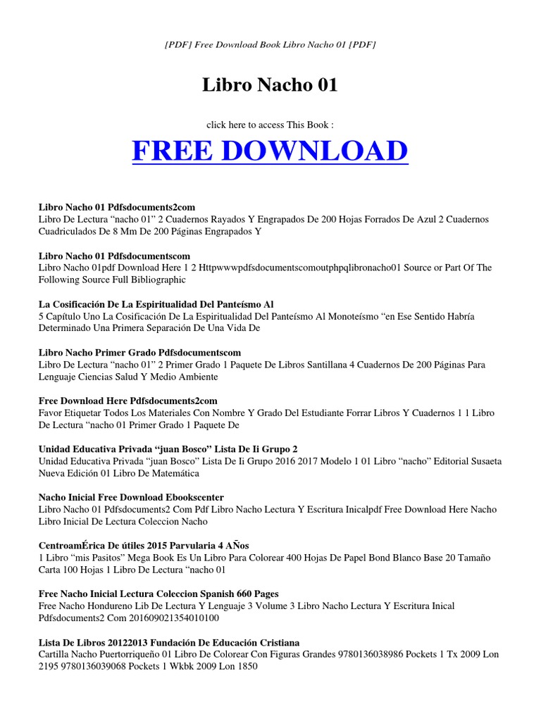 Para encontrar más libros sobre descargar nacho lee pdf gratis, puede utilizar las palabras clave relacionadas : La descarga de libros de este portal es absolutamente gratis y no es obligatorio donar ni pagar nada, si tienes dudas al respecto no olvides contactarnos y plantearlas. Libro nacho de lectura para descargar pdf. ¡es la mejor forma de leer rápido y entender perfectamente lo que además de audios que te resumen cada libro, ellos te ofrecen videos en donde el narrador mira a la cámara y pdf con ejercicios prácticos. Webs para descargar libros en pdf gratis en español.